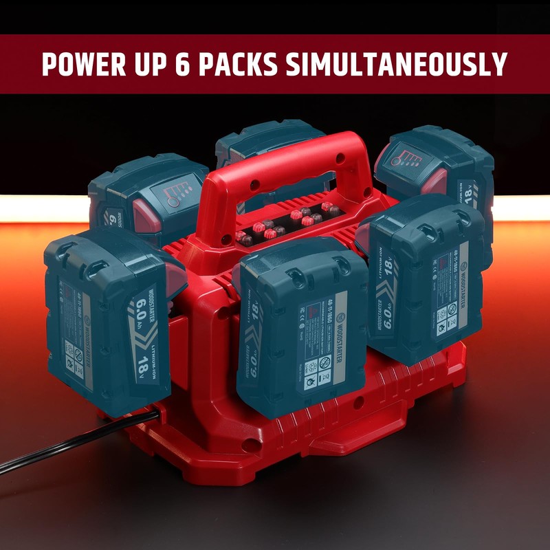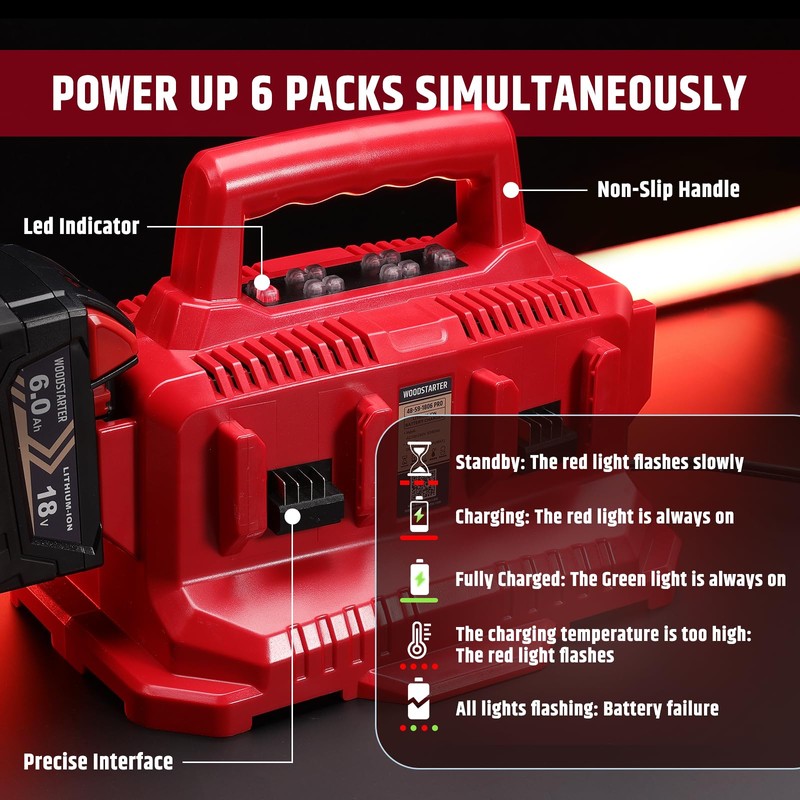 - Simultaneous 6-Battery Charging: Unlike sequential chargers, the WOODSTARTER 6-Port Charger allows you to charge six MilWaukee M18 batteries simultaneously, reducing downtiAdvanced Safety Protection: With built-in overcharge, overheat, short-circuit, and overvoltage protection, this charger ensures safe, reliable charging. Smart IC technology and LED indicators provide real-time charging status updates for added convenience me and enhancing work efficiency, perfect for busy job sites