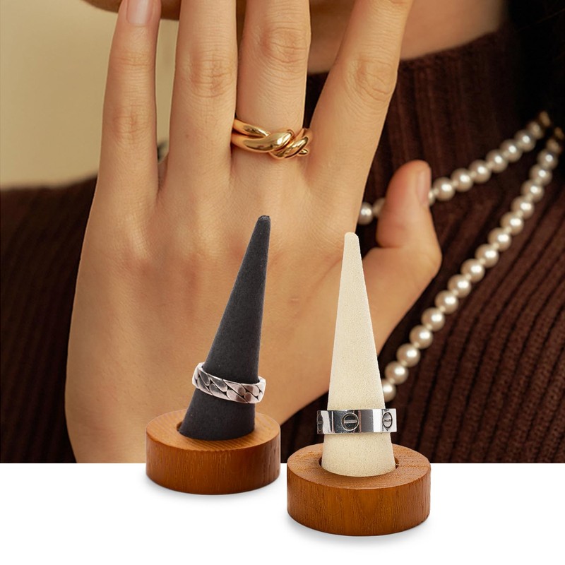 Woodten Solid Wood Jewelry Ring Stand Display Microfiber Cone Single Jewelry Ring Display Stand Showcase(Grey)