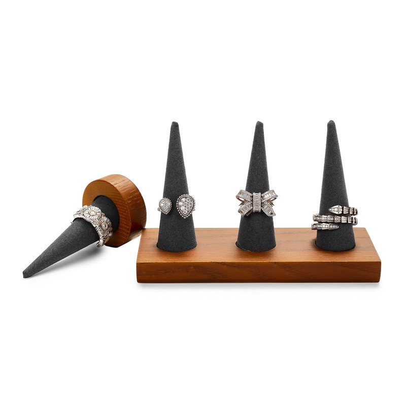 Woodten Solid Wood Jewelry Ring Stand Display Microfiber Cone Single Jewelry Ring Display Stand Showcase(Grey)