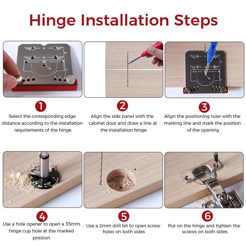 - User-Friendly Design for Effortless Setup: Simply align the door hinge jig with your marked lines, secure it using the red edge guide, and use the included marking tool to precisely mark hole centers and screw placements. This tool takes the guesswork out of hinge installation, allowing even beginners to achieve professional results.
