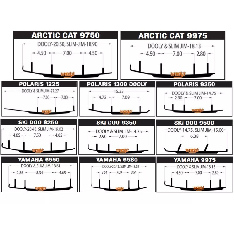 The DoolyTM has two 7/16” Flat-top runners mounted on a plate for each ski. The four contact lines on the snow surface will help decrease darting of your sled as it makes its own groove in the trail. When in a turn, only one of the DoolyTM bars will be in contact with the snow or ice. Therefore, a DoolyTM with 6” of carbide on both runners will have the same turning power as a single runner with 6” of turning carbide. The DoolyTM is available in 4”, 6”, and 8” of 60o turning carbide for Arctic Cat, Polaris, Ski Doo and Yamaha snowmobiles. Each DoolyTM is packaged individually.