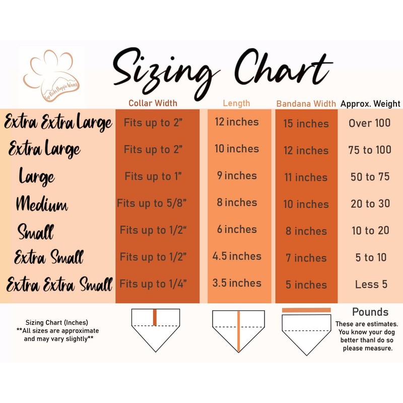 Search “Top Rocks Doggie Wear (insert size you’re looking for)” to see all the available bandanas in your desired size.