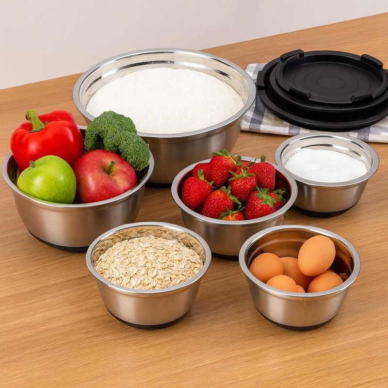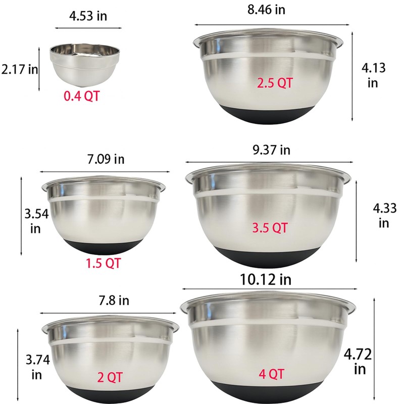 - Upgrade your kitchen with this versatile mixing bowl set! It includes 5 stainless steel bowls with airtight lids (1.5 to 4 qt), plus a bonus mini bowl — perfect for mixing, prepping, serving, and storing