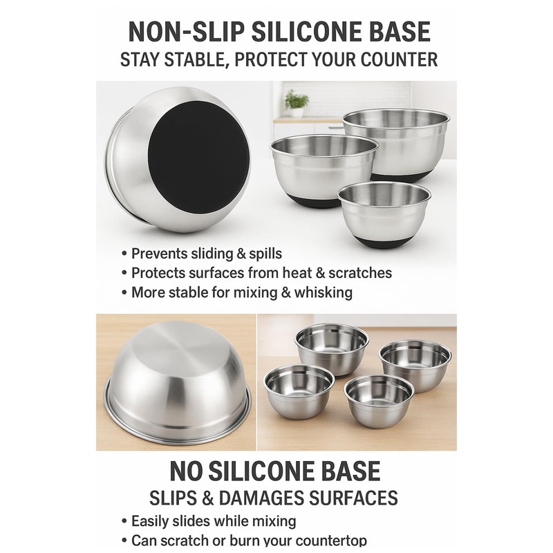 - Each bowl has a non-slip silicone base to stay steady while you mix, and the 4QT bowl features a removable center lid that lets you add ingredients or use with a blender without removing the full cover — no more mess or splashing