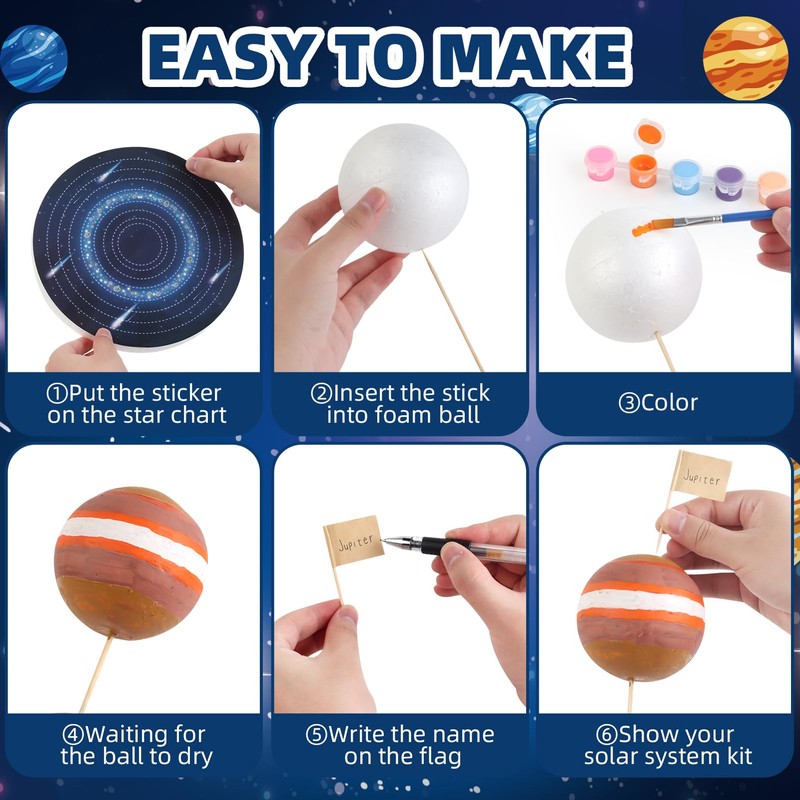- High QualityThe solar system science kit for kids 3-5 is made of durable polystyrene foam with a smooth surface that's easy to color, and includes 12 acrylic paints, which are safe and odorless. Kids can use their imagination to create the planets of the school solar system project!