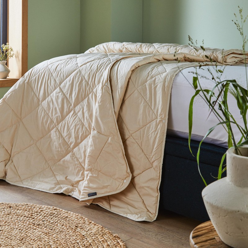 Woolroom - Deluxe Lightweight Machine Washable Wool Comforter Wrap yourself up in ultimate comfort with our washable wool comforter. Wool has temperature-regulating properties, keeping you from overheating while you sleep. It’s ideal for those struggling to sleep at night due to the hot weather or night sweats. Natural everyday comfort: Incredible temperature-regulating properties Superior moisture management Naturally hypoallergenic - approved by Allergy UK Made from the finest 100% traceable Chatsworth British Wool ID Machine washable - no felting or shrinking Encased in a breathable 200 thread organic cotton outer No synthetic materials or fibers added British wool filling of 5.9 oz sq/yd - for better sleep in warmer months With decades of experience in sourcing exceptional British wool, the Woolroom journey began in 2008. On a mission to break the unfounded stigma surrounding this incredible natural fiber and inspired by a passion to provide healthy sleep night after night, just as nature intended, we have created a sleep and bedroom accessories range of the highest quality and process standard. We pride ourselves on the quality of our products which begins with carefully selected wool to ensure the right breed for the right need. We only source our wool from the best farmers, who adhere to The Five Freedoms of animal welfare. The shearing process which happens in spring or summer is an essential process to keep sheep happy and healthy. Rest easy knowing that our bedding is good for you and good to nature, without compromising on quality. While wool can feel different from other fiber types, we are so confident that our bedding will improve the way you sleep. We offer a 30 Night Sleep Trial for you to snuggle down and settle in. If you are not head over heels, you can return it.