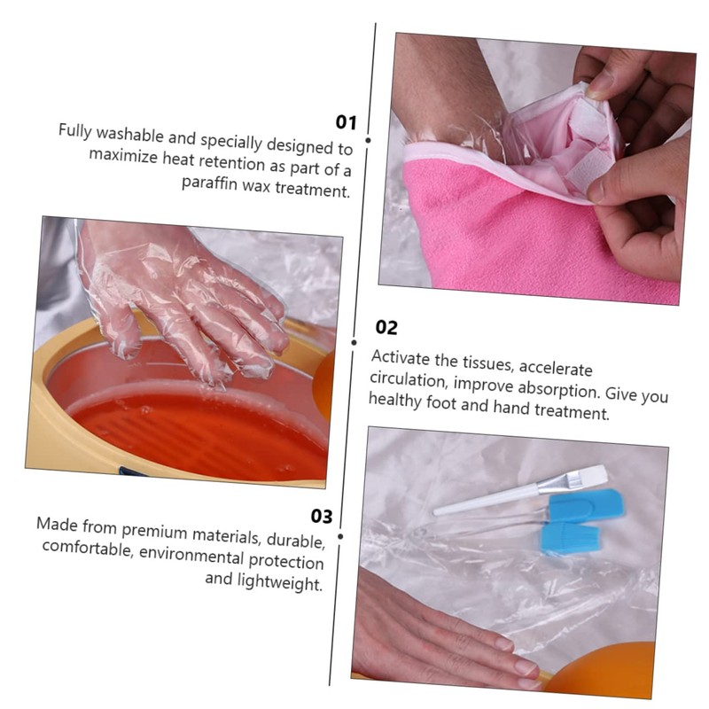 - Paraffin wax machine: paraffin wax bath liners gloves and booties set - keep the wax warm on your hands and feet after doing the paraffin wax. to help maximize moisture absorption into the skin for a good effect.