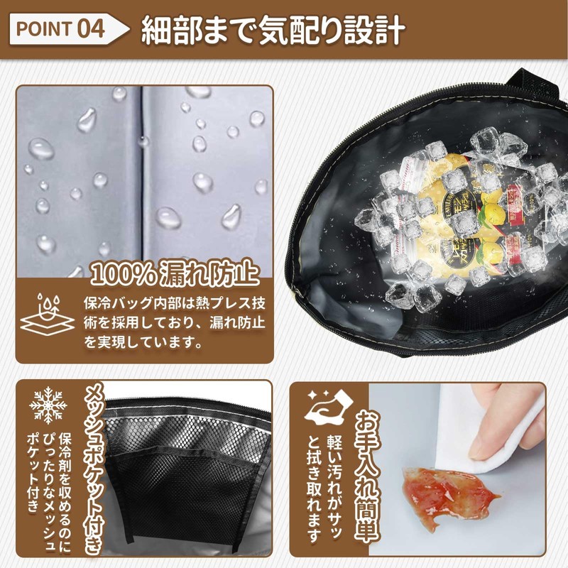 - 【100%漏れ防止】保冷バッグの内側は継ぎ目のないホットプレス技術を採用したことで優れた防漏れ性能を実現(氷が完全に溶けても浸出リスクなし)するだけでなく、内側には撥水加工生地を使用。水滴や汚れはサッと拭き取れるため、衛生面と利便性を兼ね備えた二重の安心設計となっております。