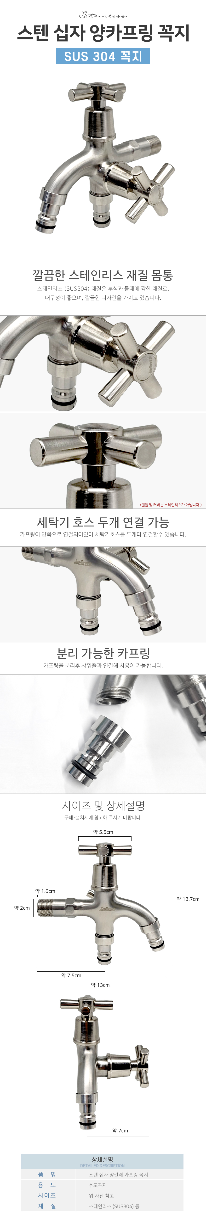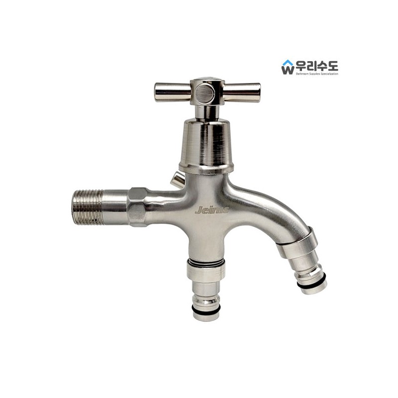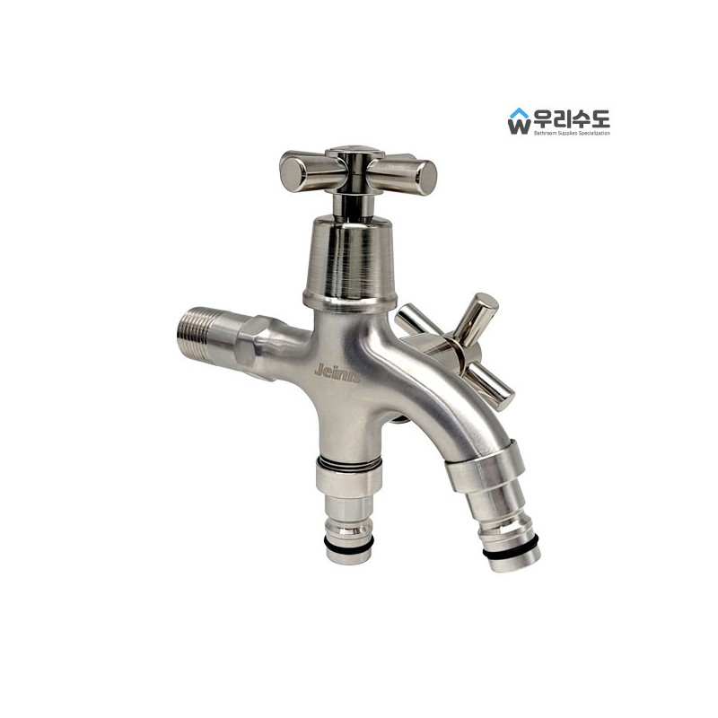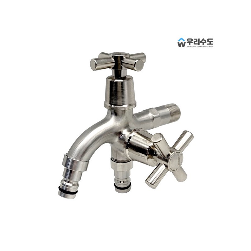 Woori Water SUS304 Stainless Steel Cross Double Coupling Two-prong Faucet Washing Machine Faucet / 우리수도 SUS304 스텐 십자 양카프링 두갈래꼭지 세탁기 수도꼭지