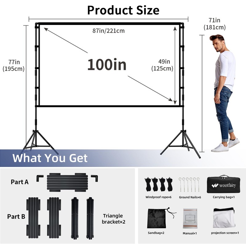 - What You Get100 inch HD projection screen1, Part A (Crossbar6, Connector5, 90Connector2), Part B (Crossbar8, Connector8), Triangle bracket2, Sandbag2, Windproof rope6, Ground Nails6, Manual1, Carrying bag1. If you do not receive a right size item or missing any accessories, we will help you solve your problem.