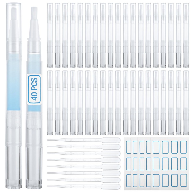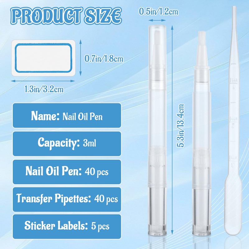 • 40 PIECES OF CUTICLE CARE OIL PENS - You will receive 40 empty nail oil pens, each with a capacity of 3 milliliters, along with 40 plastic droppers and 5 label stickers. The quantity is sufficient to meet your various usage needs, such as daily use, replacement use, or sharing with family and friends
