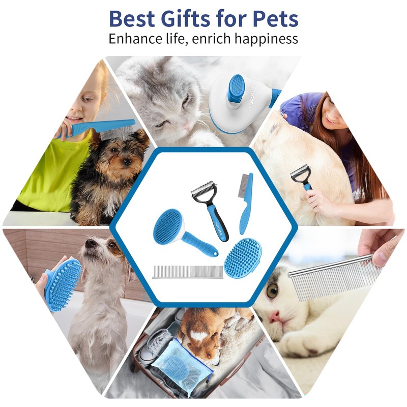 WOPQAEM 5 in 1 Dog Grooming Kit - Self-Cleaning Slicker Brush for Shedding Short Long Haired Dogs & Cats, Includes Pet Comb, Flea Comb, Bath Brush, Undercoat Rake - Complete Fur Care Set - Blue