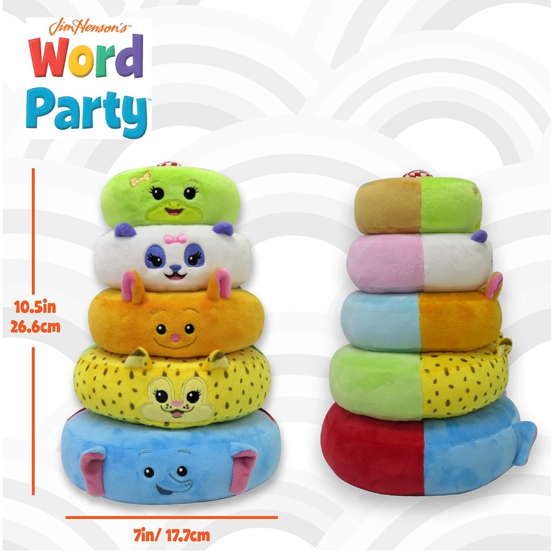 This Word Party Plush Stacking Toy is the newest addition to the Word Party collection. Word Party’s take on a classic toy, this plush ring stacking toy is Made of soft, colorful fabric this ring stacking toy is great for fostering motor skills, hand eye coordination, and much more. Safe for your baby and soft to the touch. Sturdy base helps prevent tipping.