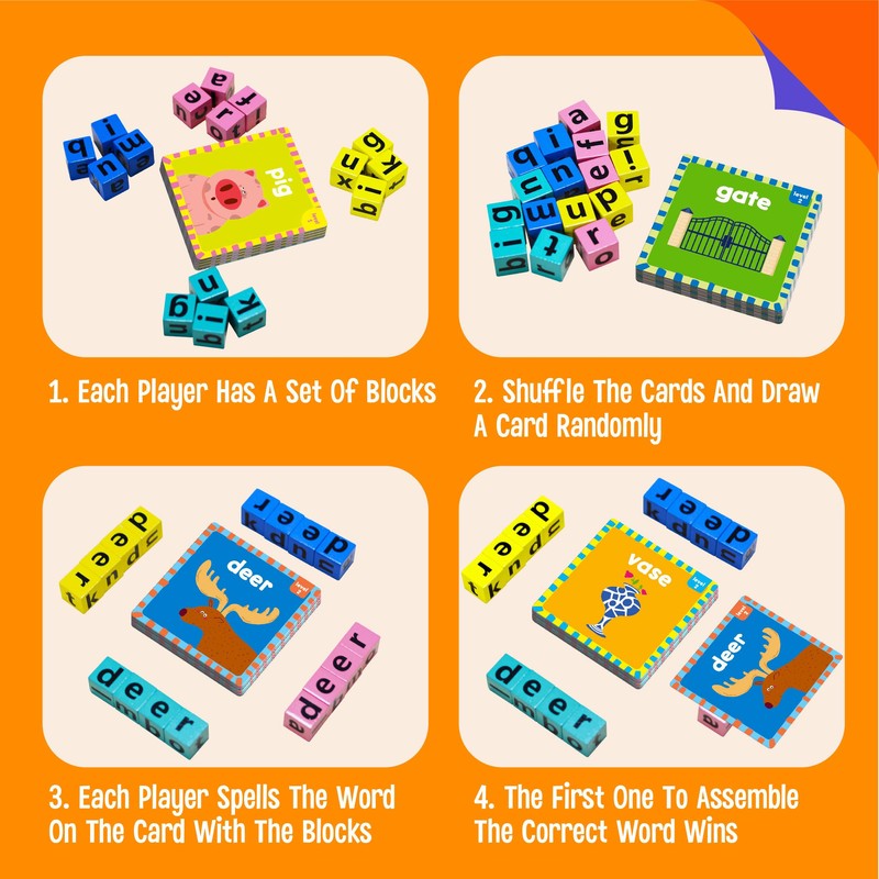 Funny & Easy Game: Each card is double-sided design, one side displays a CVC word while another side presents a four-letter word. 16 wooden blocks are divided into 4 groups by colors, which allows four kids to arrange the wooden letter blocks to form the word on the card at the same time.