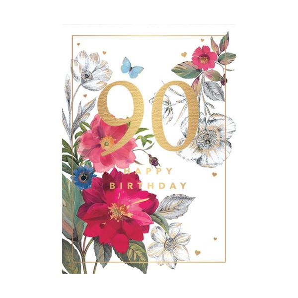 Words and Wishes Female 90th Birthday Card - Gorgeous Floral Design - Gold Foil Lettering