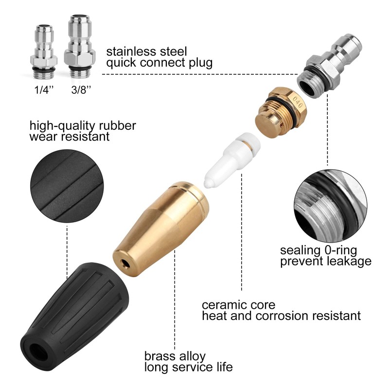 - High-Quality Material: The pressure washer turbo nozzle is made of a durable ceramic core, external rubber, brass, and stainless steel quick plugs. The top ceramic ball is the key for the turbo nozzle and spins under high pressure without wearing out, which is much more wear-resistant than metal and improves the service life of the nozzle.
