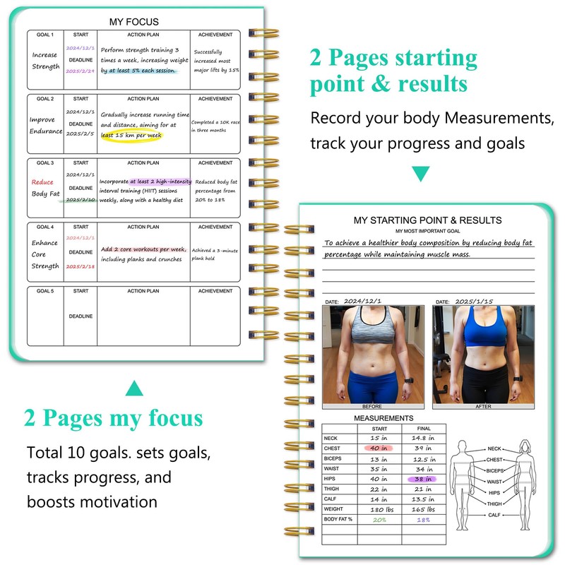 - Set and Conquer Your Fitness Goals: Define up to 10 fitness focus and track your journey towards achieving them. Our workout log book provides dedicated space for goal setting and performance tracking, keeping you motivated and focused