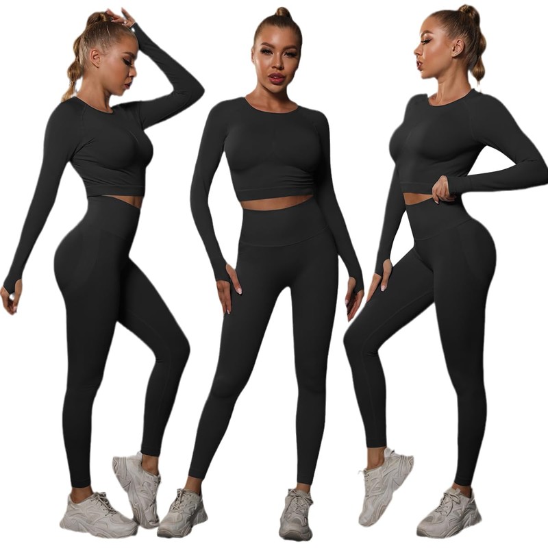 Workout Outfit for Women Two Piece Seamless Long Sleeve Crop Top & Yoga High Waisted Leggings Scrunch Butt Athletic Gym Set