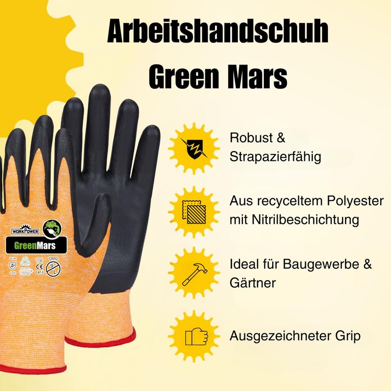 WORKPOWER Green Mars Work Gloves for Men - Non Slip Nitrile Coated Gloves - Available in Sizes 9 (Orange/Black)