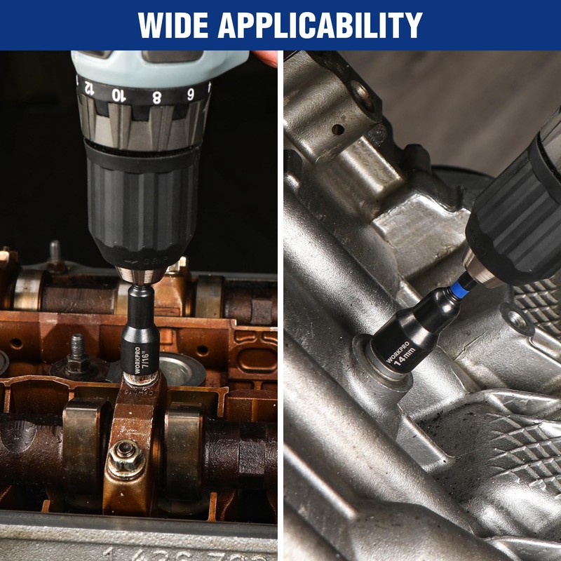 - Set Include: WORKPRO quick-change power nut driver bit set includes 6PCS metric magnetic nut driver(8mm, 10mm, 11mm, 12mm, 13mm, 14mm) , 6PCS SAE magnetic nut driver: (1/4'', 5/16'', 3/8'', 7/16'', 1/2'',9/16")