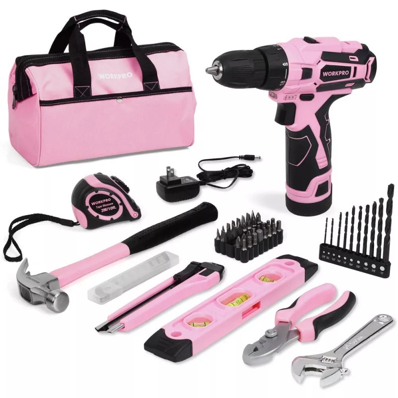 WORKPRO 61 PC Pink Tool Set with 12V Cordless Drill Driver Include: