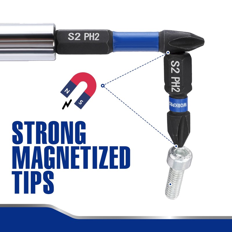 WORKPRO 16pcs PH2 Impact Phillips Screwdriver Bit Set, CNC Machined S2 Steel Tips with Magnetism, 1/4" Hex-Shank Driver Bits, 1"& 2" Long Impact Screwdriving Bits with Storage Box