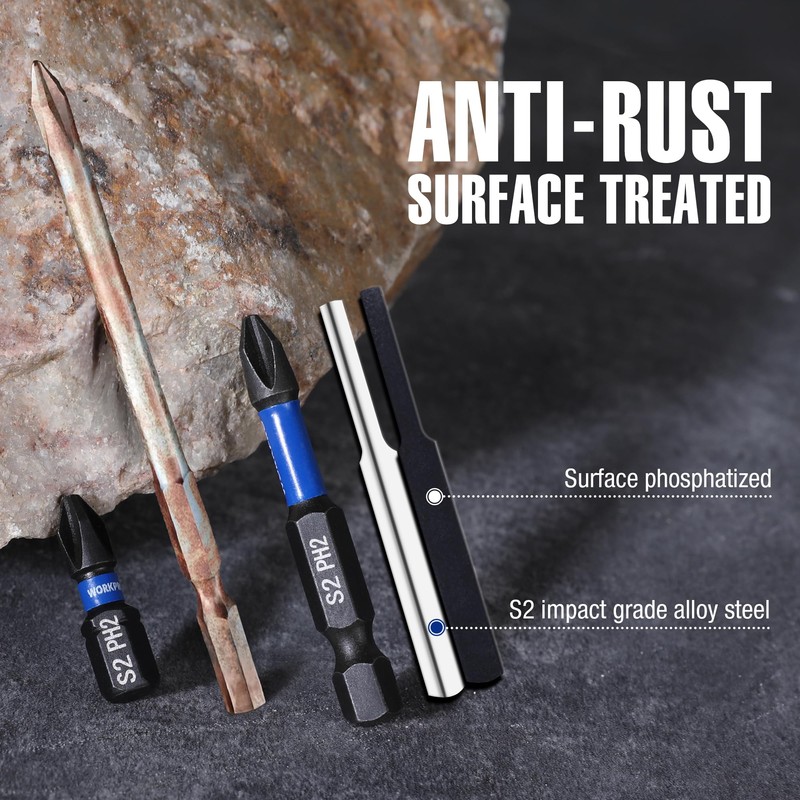 - With 16pcs of 1" & 2" PH2 impact phillips bits, this set is a perfect choice to replace worn-out bits and keep your tools in top shape. Manganese phosphate surface gives them better rust and corrosion protection