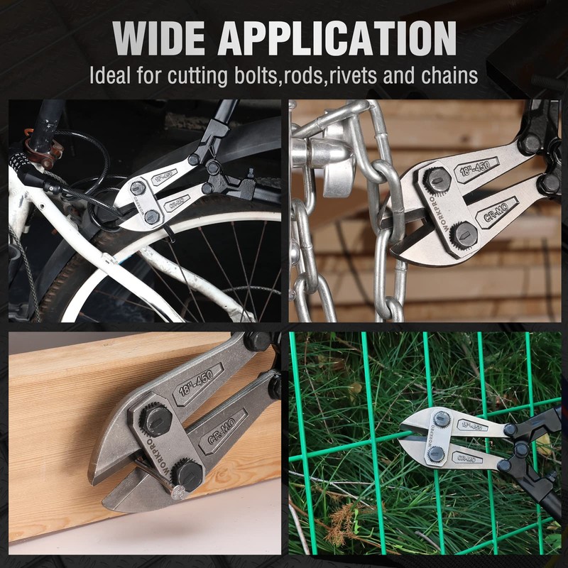 - WIDE APPLICATION-The bolt cutter can tackle a variety of cutting tasks, suitable for cutting chains, nets, wires, poles, screws, and other metal materials. Widely used in industrial job sites or home improvement projects, repair jobs, and more.