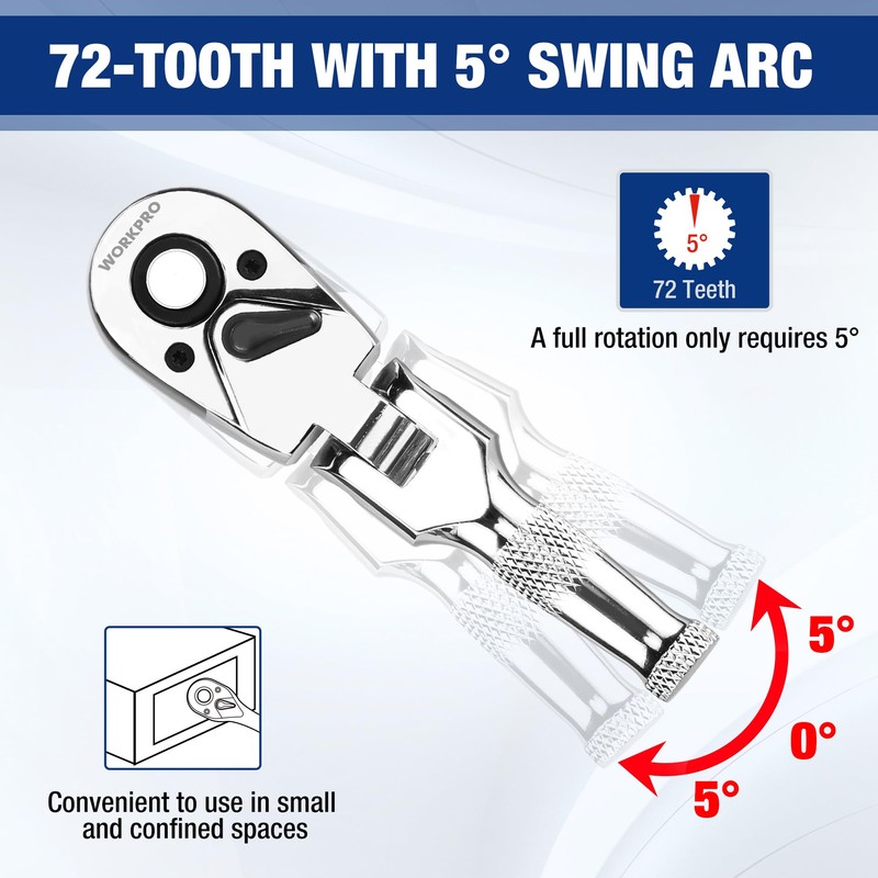 - With 72 Teeth: WORKPRO Ratchet Handle set with 72 teeth of each ratchet handle . More labor-saving and convenient to use. The ratchet handle head can change direction and can rotate up to 5°