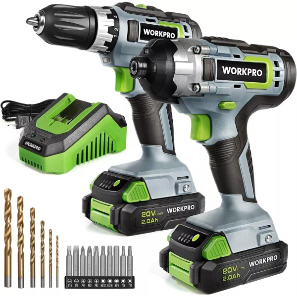 WORKPRO 20V Cordless Drill Combo Kit Drill Driver&Impact Driver 2x 2.0Ah Battery
