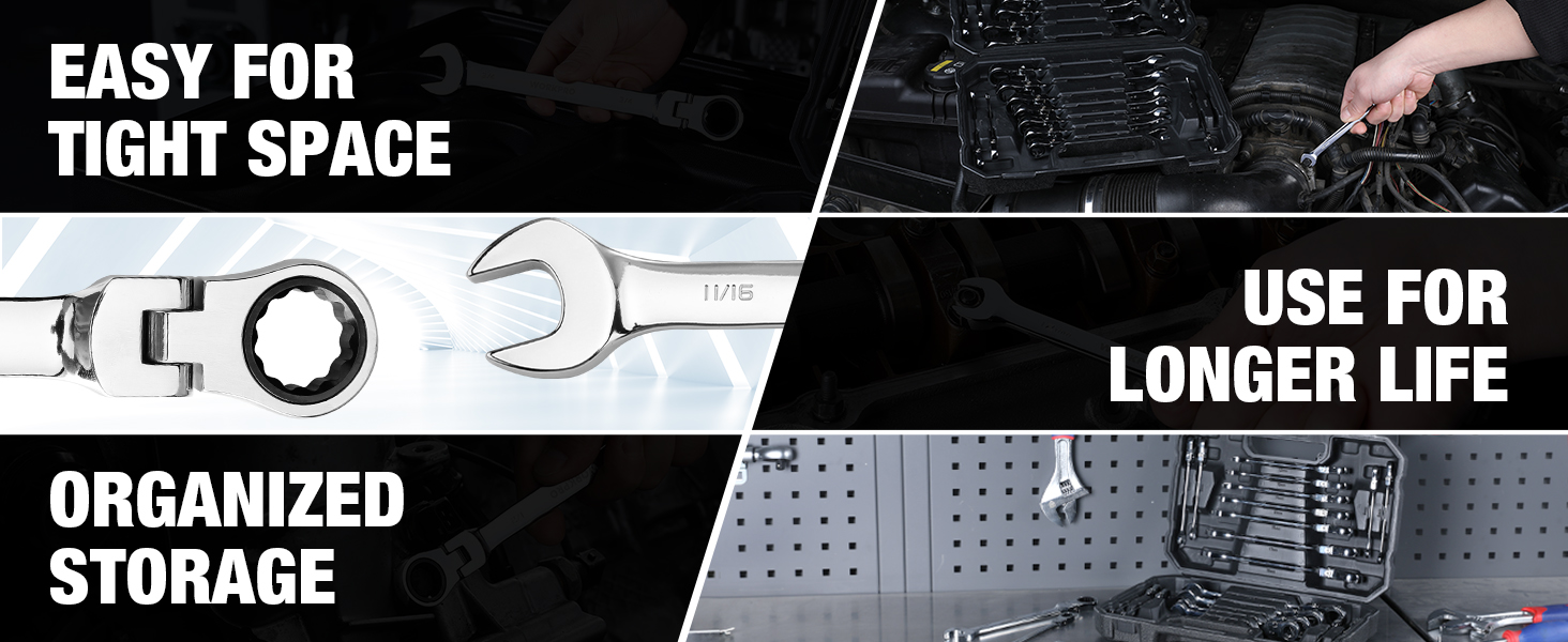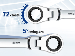 • 180-degree flex head and 5-degree swing help tighten bolts efficiently, and are suitable for tight spaces where most ratchet wrenches would not reach. This ratcheting combination wrench is set up with 72-tooth ratcheting system and precision machined to fit tightly onto fasteners