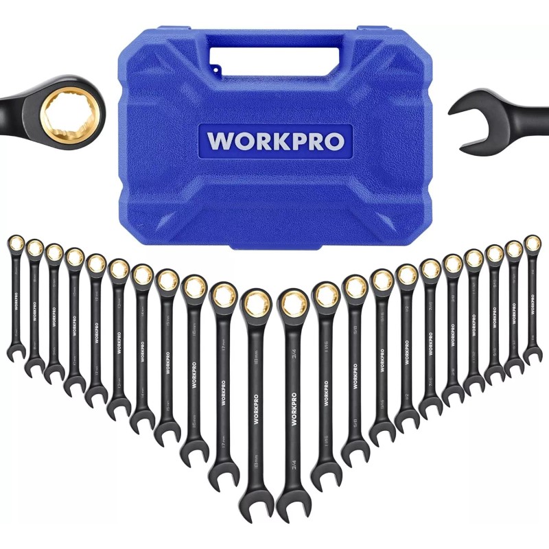 WORKPRO 22-Piece Ratcheting Wrench Set Anti-slip Teeth SAE 1/4-3/4 Metric 6-18mm