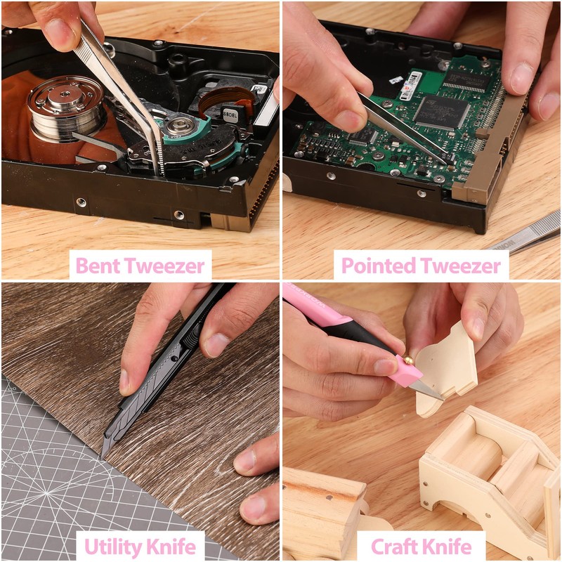 - Multifunctional Pink Tool Set: 33PCS Precision Repair Tool Set contains precision screwdrivers set, pliers set, tweezers, craft knife with 5pcs blade, and utility knife with 10pcs blade. Precision repair kits can repair various electronic devices, such as computers, notebooks, iPhones, ps4, toys, glasses, lamps, small appliances, etc. For screen replacement, replacement of critical electronic components, cleaning, demolition, remodeling of building equipment, etc