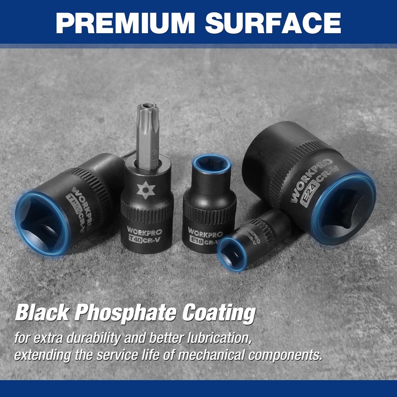 - Premium Technology: The surface with Black Phosphate Coating of socket set is for extra durability and better lubrication, extending the service life of mechanical components. Toxin-free production for safer use