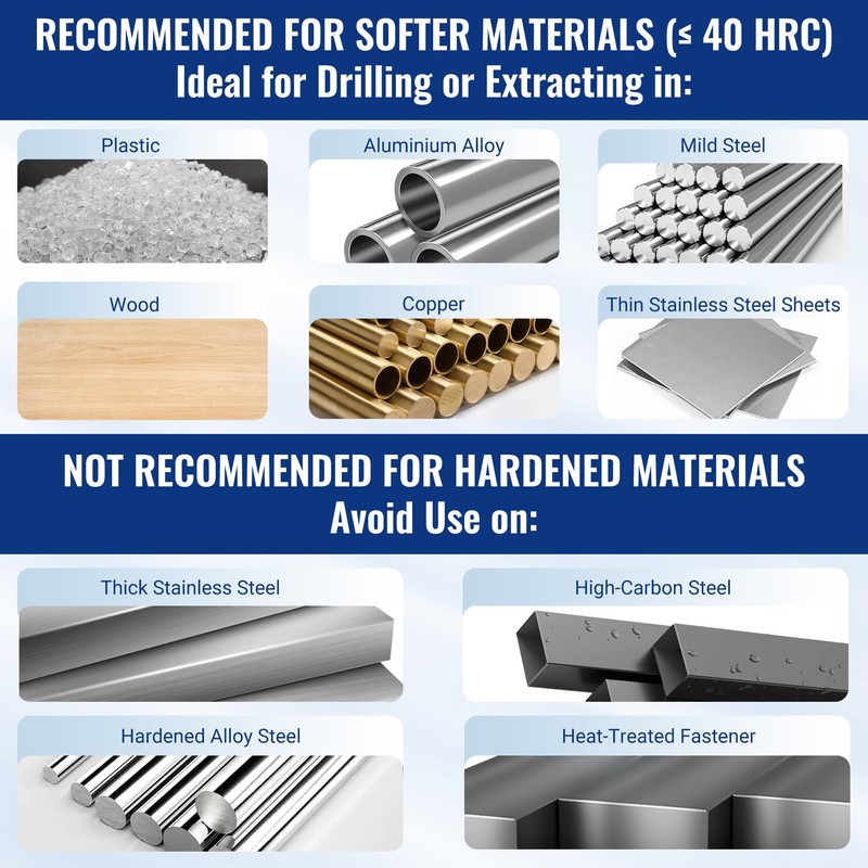- Use Tips: Both drilling operations require the electric drill to be set to reverse mode. The extractor may become hot during the drilling process, so it is essential to wear gloves to avoid burns.