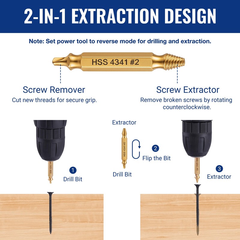 - Simple 2-Step Extraction: Just drill a pilot hole, then reverse out the damaged screw—no grinding, center punching, or bolt prep required. Works even on rusted hardware. Easily remove stubborn screws and phillips head screws.