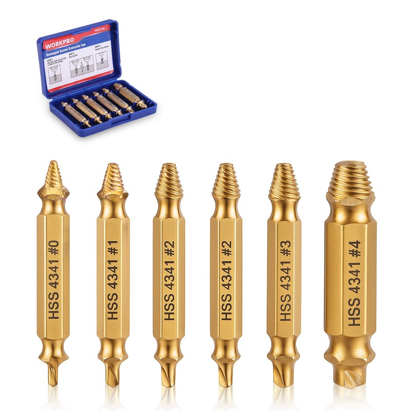 WORKPRO 6PCS Screw Extractor Set, Titanium Coated Damaged Stripped Screw Remover Kit, Ez Out Broken Bolt and Screw Extractor Tools, Premium 4341 HSS Reverse Drill Bits, Father's Day Gifts for Men