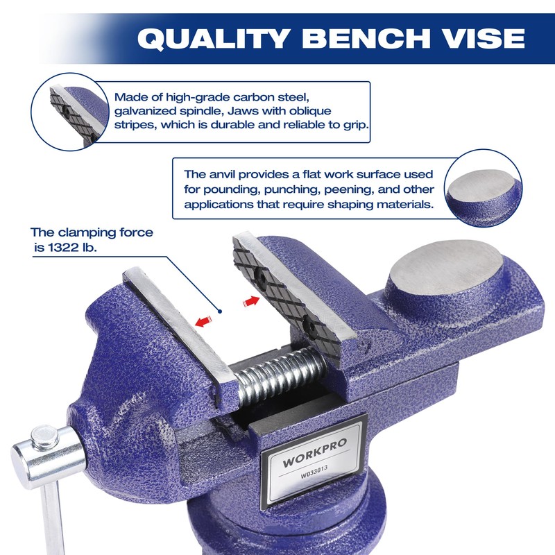 - 【QUALITY MATERIAL】The vice for workbench is made of high-grade carbon steel, galvanized spindle, and Jaws with oblique stripes, which are reliable to grip and have high product hardness. The clamping force of this universal vice is 1322lb, which is durable for long-term use.