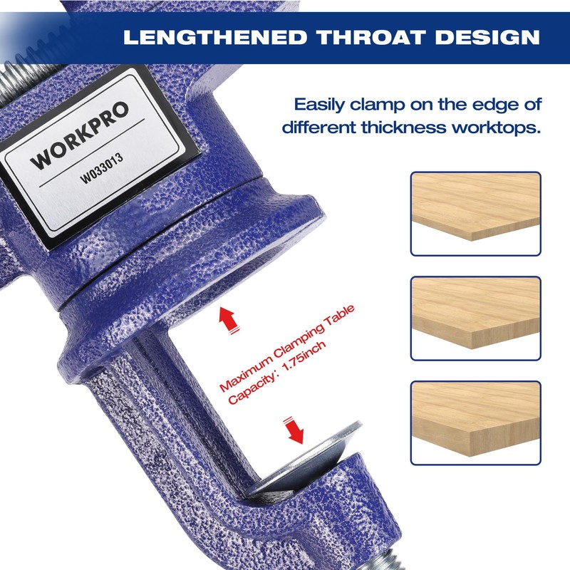 • 【EASY INSTALLATION】Jaw Width 2.56", Jaw Opening 2.44", Throat Depth 1.18". There is no need for punching on the table. This bench vise is easy to install and it can easily clamp on the edge of all kinds of desktops. Convenient and quick to install and remove, effortless and time-saving.