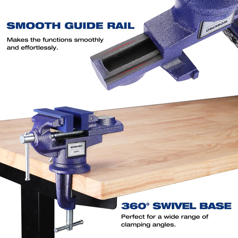 • 【360°ROTATION】Designed with a 360-degree swivel base, this workbench vise is perfect for a wide range of clamping angles, allowing users to realize multi-angle operation without removing the vise, easy and convenient. A smooth guide rail makes the functions smoothly and effortlessly.
