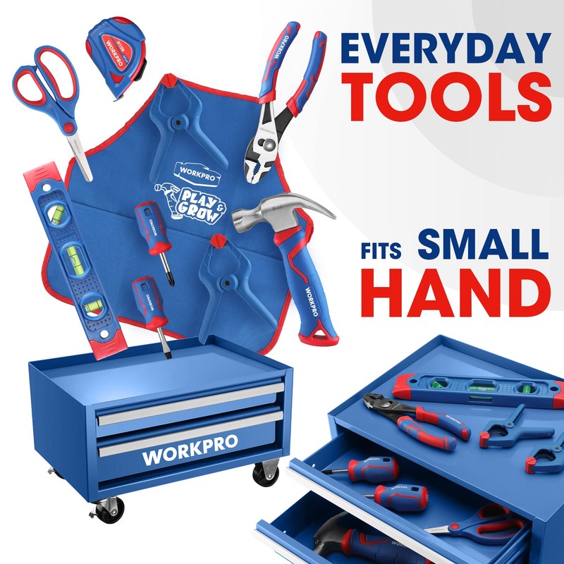 WORKPRO Kids Real Tool Set with 12 Inch Steel Tool Chest with Wheels, 10PCS Boys First Tool Set with 2 Drawers Blue Metal Rolling Tool Chest, Kids Woodworking Tools for DIY, Home Repair