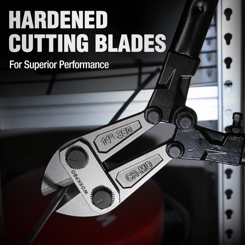 This WORKPRO bolt Cutter is featured with molybdenum steel jaws, compound cutting action requires less effort. Bi-material soft handle for comfortable cutting.