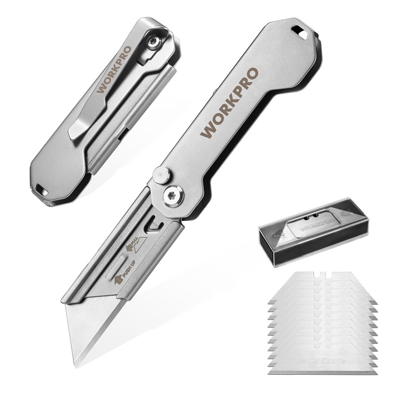 WORKPRO 2PCS EDC Folding Utility Knife, Mini Box Cutter with Quick Open Axis Lock, Quick Change Blade Razor Knife, Foldable Small Pocket Knife with Belt Clip, 2 Packs with 10 Extra Blades