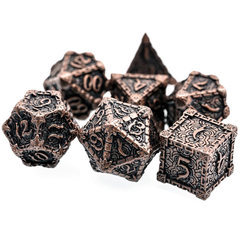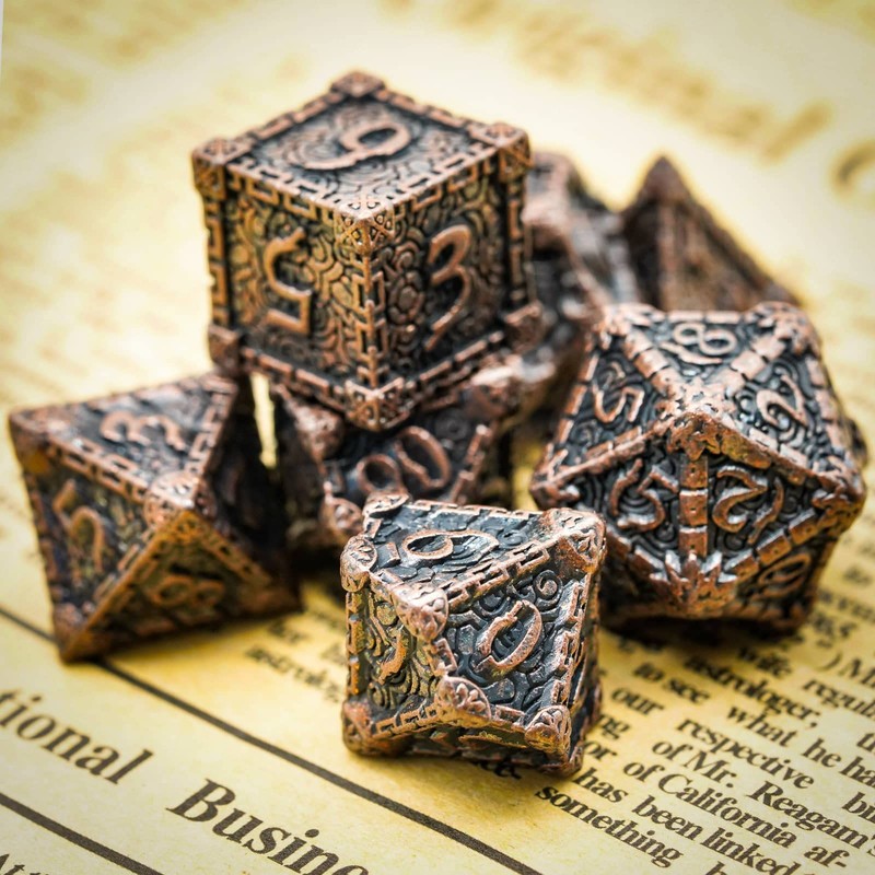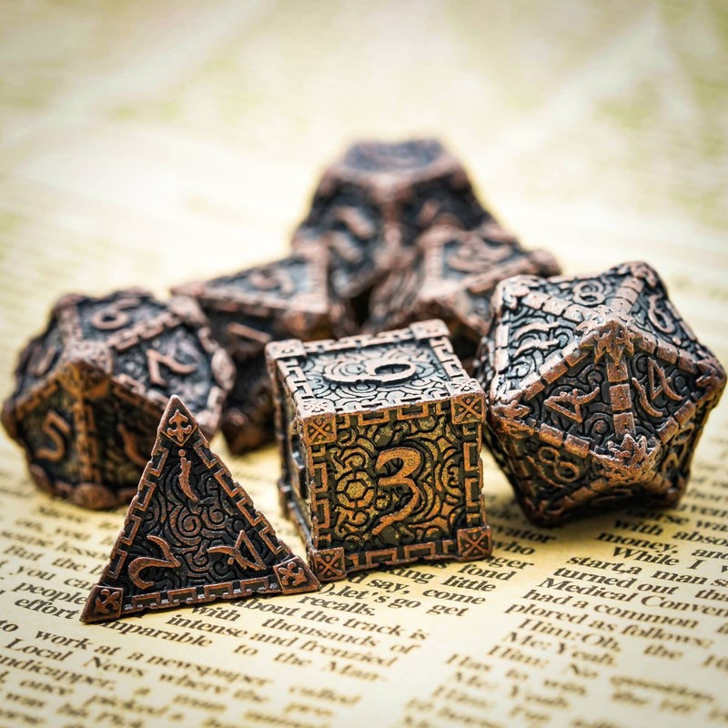 - Ideal cube set - Included are 7 metal cubes in bronze look. 1 x D4, D6, D8, D10, D10.0, D12, D20, suitable for all standard pen and paper game systems. The 1 is symbolised as a dagger. Ideal for all villains.
