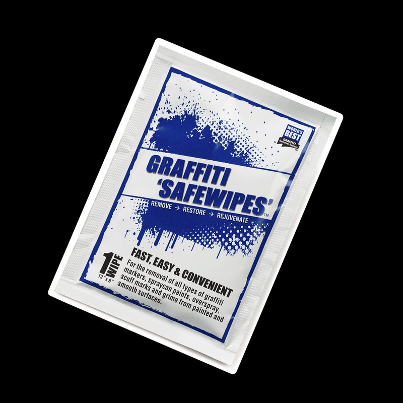 Graffiti Safewipes graffiti remover wipes will remove all types of graffiti markers, spray can paints, overspray, scuff marks and grime from painted and smooth surfaces.