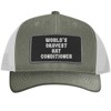 World's Okayest Hat Conditioner - Leather Black Patch Engraved Trucker Hat, Heather-White, One Size