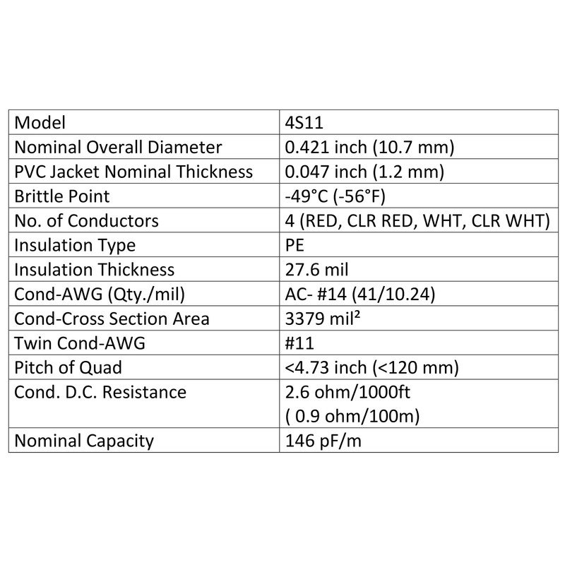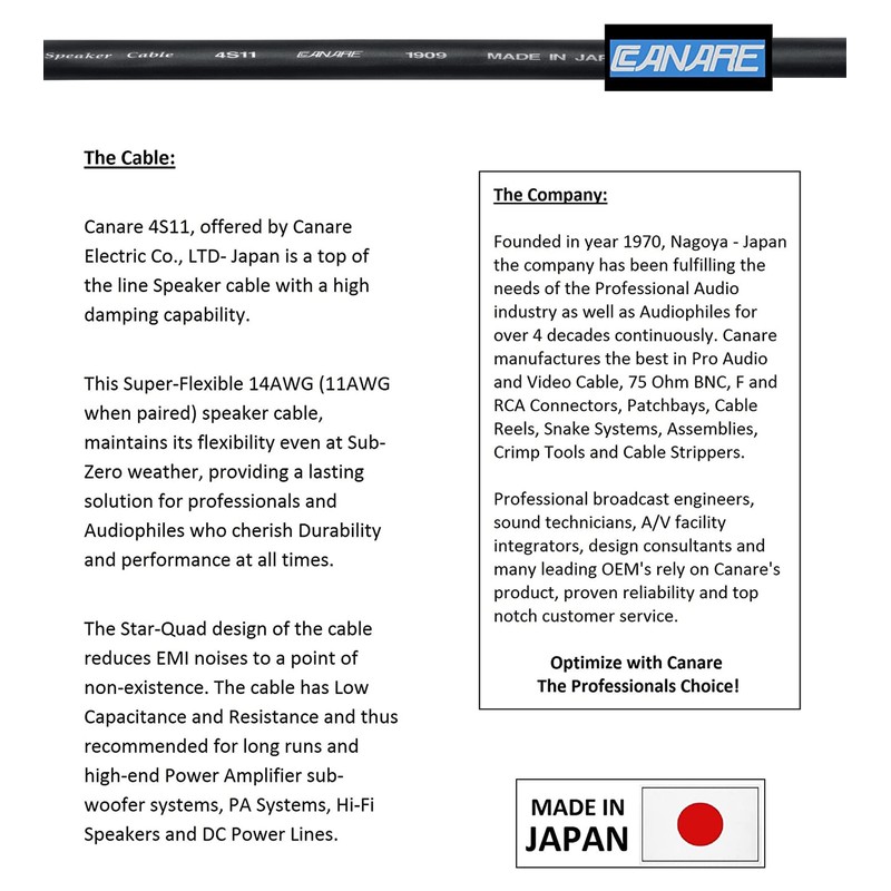 • Canare 4S11, 14 AWG per conductor (11 AWG when paired) Star-Quad (eliminates EMI noise), High damping cable is a top-of-the-line solution for super-durable (flexible even at 0°F) speaker cables. Low Capacitance & Low Resistance are ideal for non-coloration of your signal.