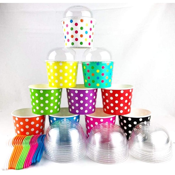 Worlds Paper Ice Cream Cups With Dome Lids No Hole and Plastic Spoons,Polka Dot 16OZ Mix 25 Set