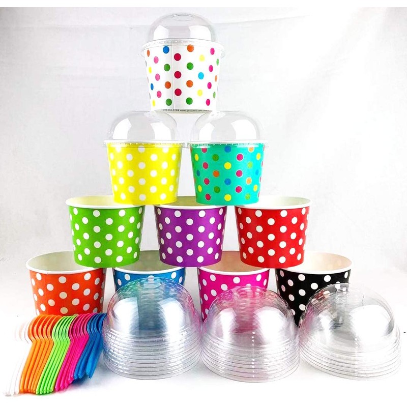 - Polka Dot Paper Ice Cream Cups is food-grade,are designed for use with hot or cold itemsrozen ,yogurt, parfaits, snacks, Hot Soups,Cake, Pie and much more!