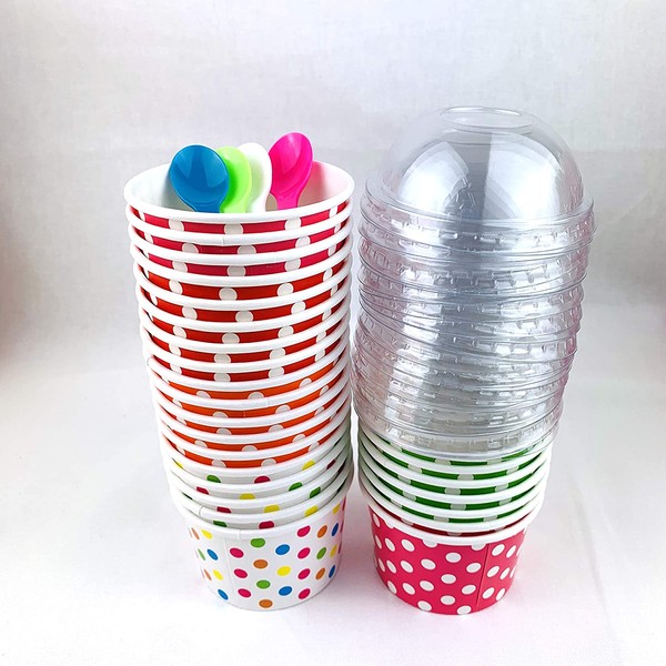 - Polka Dot Paper Ice Cream Cups is food-grade,are designed for use with hot or cold itemsrozen ,yogurt, parfaits, snacks, Hot Soups,Cake, Pie and much more!